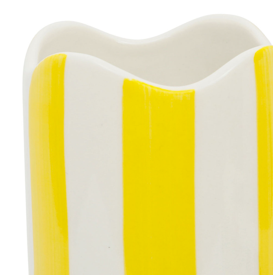 Apportez une touche artisanale et chaleureuse à votre intérieur avec le Vase Artiste Jaune. Cette pièce en grès, peinte à la main, se distingue par son design cylindrique épuré. Ses rayures couleur jaune sur fond crème lui confèrent un style intemporel et élégant.